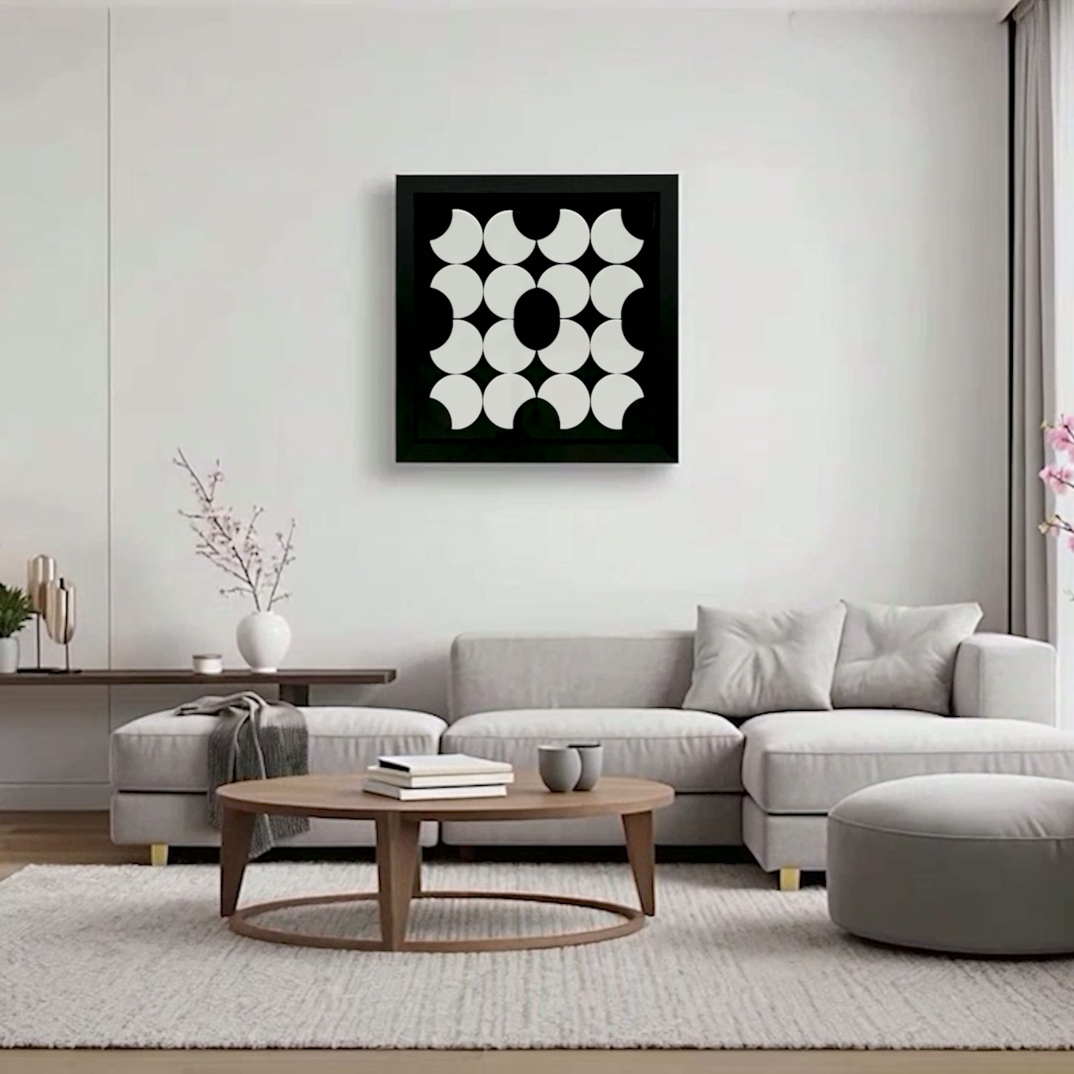 This one is more like a kinetic painting rather than a kinetic sculpture. It features twelve interconnected circles arranged in a 4×4 grid, each rotating continuously, alternating between clockwise and counterclockwise directions. As they spin, the circles generate dynamic, fluid-like patterns that constantly evolve, merge, and dissolve into one another, creating a mesmerizing visual experience.